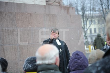 Mācītājs Guntis Kalme piedalās ziedu nolikšanas pasākumā pie Brīvības ...