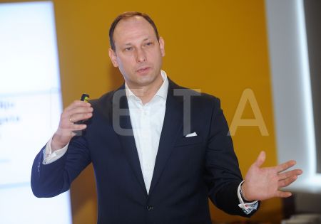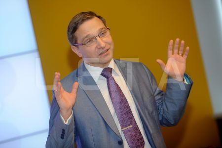 "Tele2" valdes priekšsēdētājs Valdis Vancovičs vada prezentāciju ...