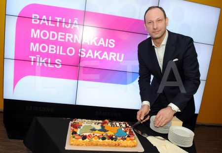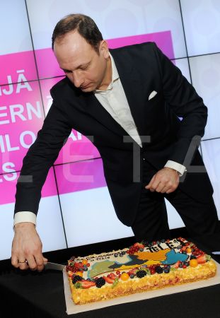 "Tele2" valdes priekšsēdētājs Valdis Vancovičs griež torti mobilo ...
