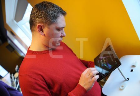 Vīrietis ar planšetdatoru mobilo sakaru operatora "Tele2" rīkotajā ...