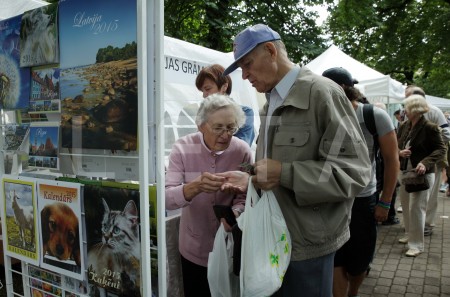Cilvēki Grāmatu ielā Rīgas svētkos Vērmanes dārzā.