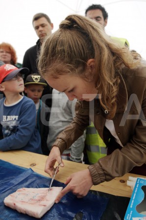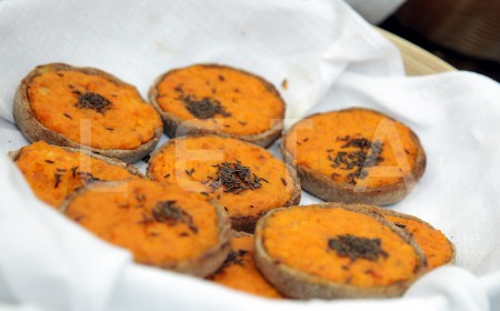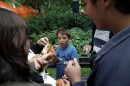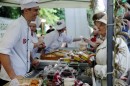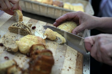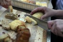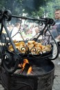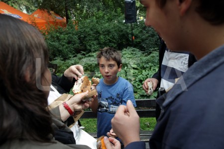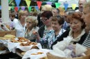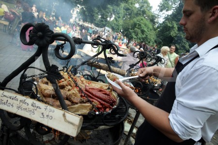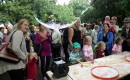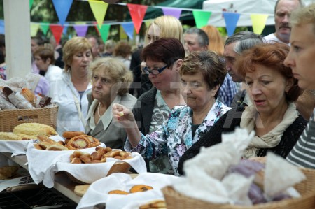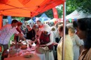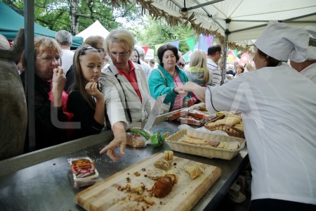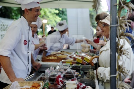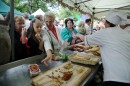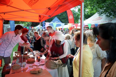 Cilvēki degustē maizi Maizes ielā Rīgas svētkos Vērmanes dārzā.