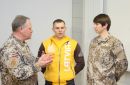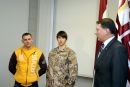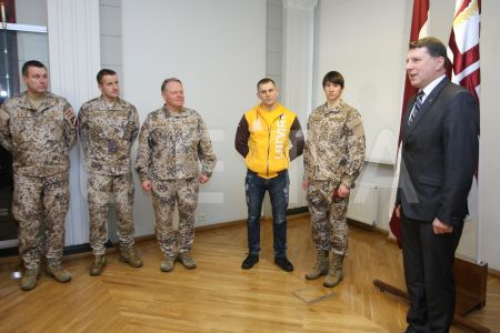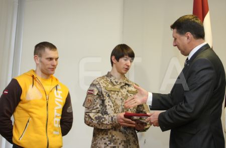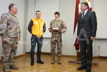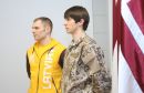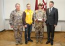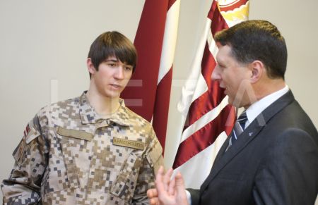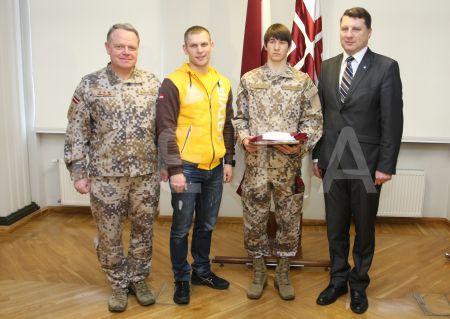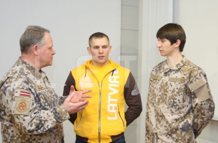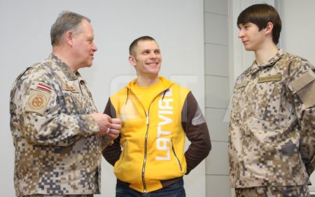 Aizsardzības ministrs Raimonds Vējonis (no labās) un biatlonists ...