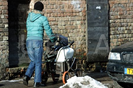 Sieviete ar ratiņiem ved metāllūžņus Miera ielā.
