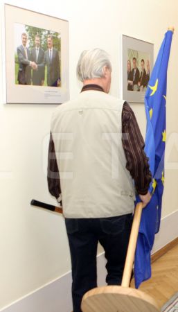 Ministru kabineta darbinieks ar Eiropas savienības karogu.