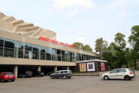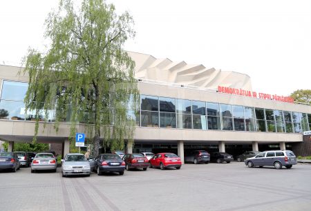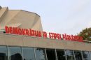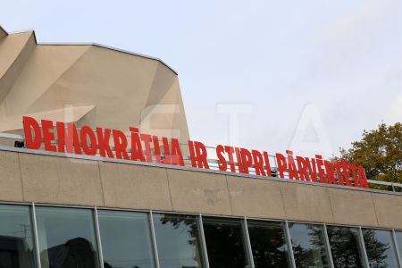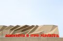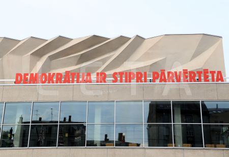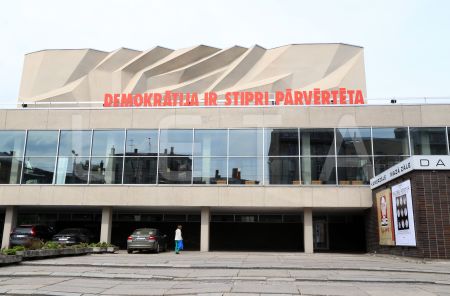 Uzraksts "Demokrātija ir stipri pārvērtēta" uz Dailes teātra ēkas ...