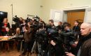 Masu mediju pārstāvji preses konferencē, kurā sabrukušā veikala ...