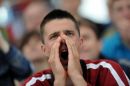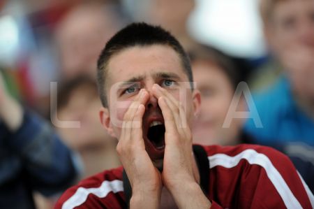 Hokeja fans Pasaules čempionāta spēlē hokejā starp Latvijas un ...