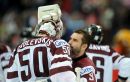 Latvijas hokeja izlases vārtsargs Kristers Gudļevskis (nr.50,balts) ...