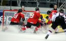 Latvijas hokeja izlases spēlētājs Kaspars Daugaviņš (nr.16,balts) ...