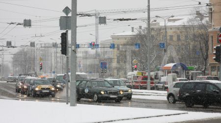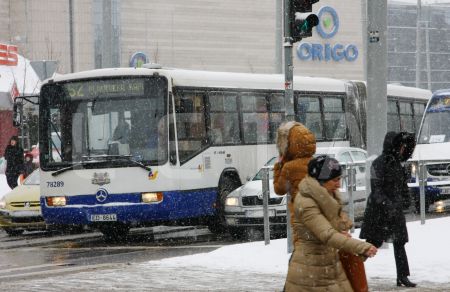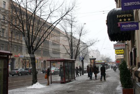 "Riga Sightseeing" ekskursiju autobuss sniegputeņa laikā Marijas ielā.