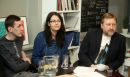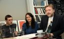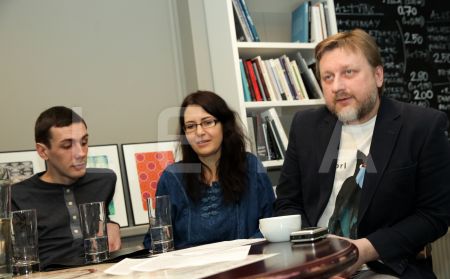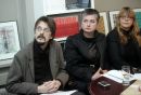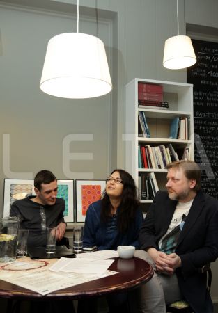 Literatūrkritiķis, dzejnieks Arvis Viguls (no kreisās), dzejniece ...