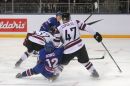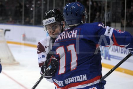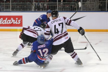 Latvijas hokeja izlases spēlētājs Mārtiņš Cipulis (nr.47,balts) ...