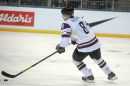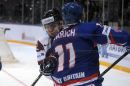 Latvijas hokeja izlases spēlētājs Sandis Ozoliņš (nr.8,balts) ...