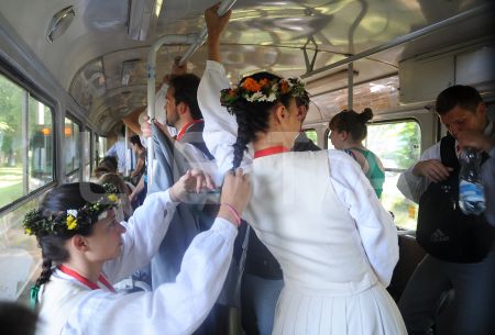 Dalībnieki tramvajā pirms XXV Vispārējo latviešu dziesmu un XV Deju ...