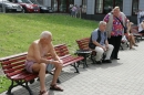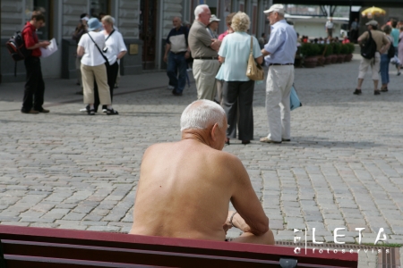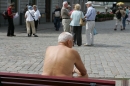 Cilvēki Rātslaukumā maija karstajā dienā.