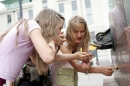 Meitenes veldzējas pie strūklakas Rātslaukumā.