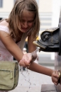 Meitene veldzējas pie strūklakas Rātslaukumā.