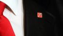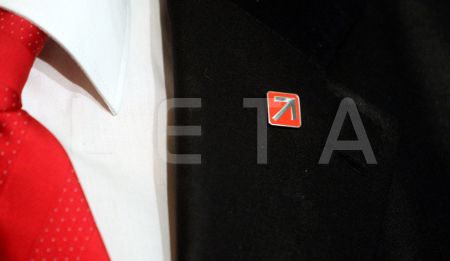 Reformu partijas nozīmīte pie žaketes atloka.