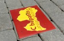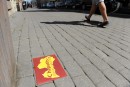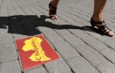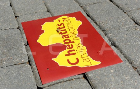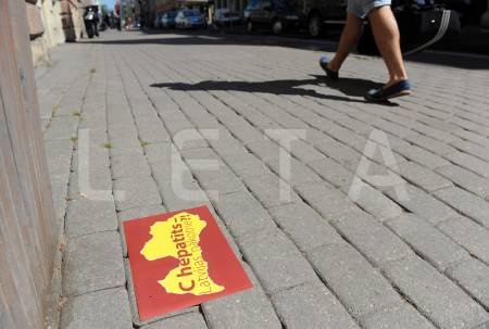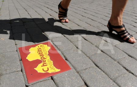Uzlīme ar uzrakstu "C hepatīts - Latvijas nakotne?!" uz trotuāra pie ...