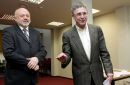 Konkursa žūrijas vadītājs Miervaldis Mozers (no kreisās) un ilggadējs ...