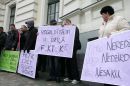 Cilvēki piketē pie Rīgas apgabaltiesas pirms "Latvijas Krājbankas" ...