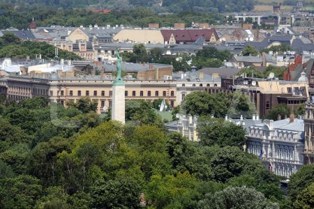 Skats uz Brīvības pieminekli un namu jumtiem.