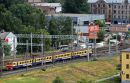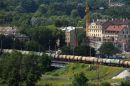 Skats uz vilciena sastāvu no Latvijas Zinātņu akadēmijas ēkas.