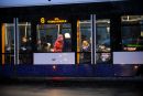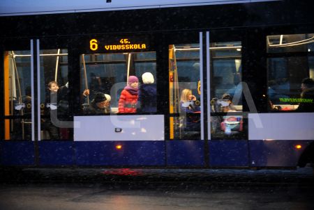 Cilvēki tramvajā.