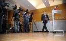 Rīgas domes priekšsēdētājs Nils Ušakovs ierodas uz preses brīfingu, ...