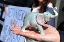 Cilvēki ar plakātiem piedalās protestā pret dzīvnieku izmantošanu ...