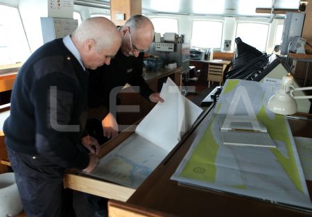 Kuģa komandas locekļi preses pasākuma laikā uz ledlauža "Varma", kurā ...