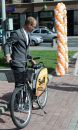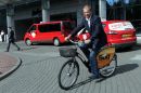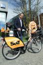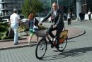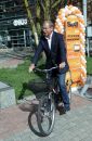 Rīgas domes vicemērs Andris Ameriks izmēģina jauno velosipēdu "SiXT" ...
