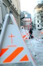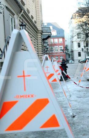Brīdinājuma zīmes par ledus krišanu no ēku jumtiem Jēkaba ielā.