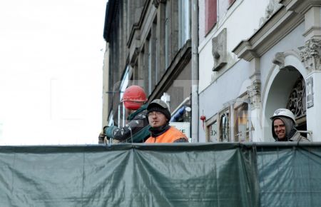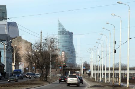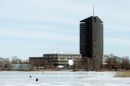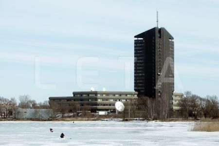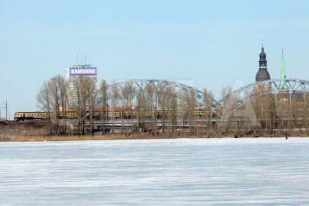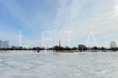 Skats uz aizsalašu Bieķengrāvi un Latvijas televīzijas ēku.