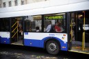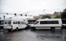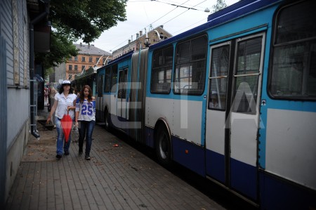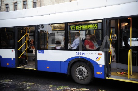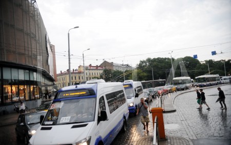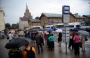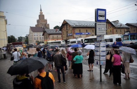 Cilvēki sabiedriskā transporta pieturā pie Centrālās dzelzceļa ...