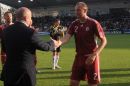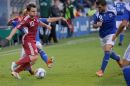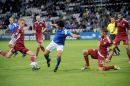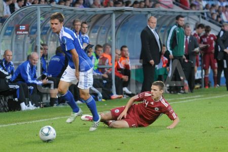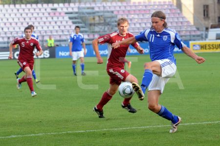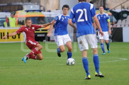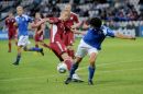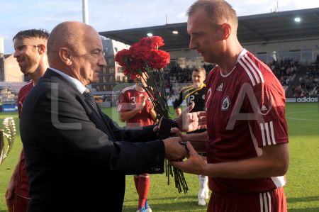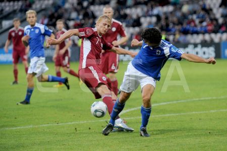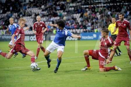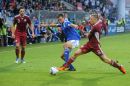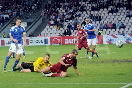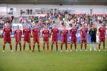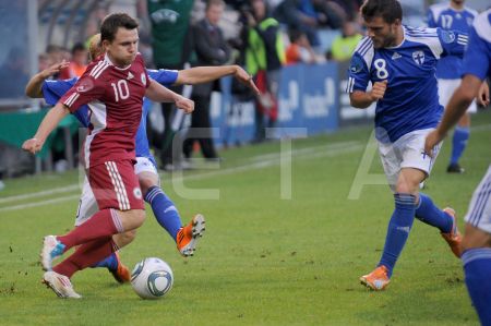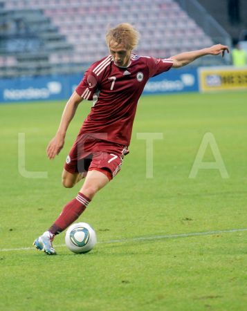 Latvijas futbola izlases spēlētājs Artjoms Rudņevs (nr.11, sarkans) ...