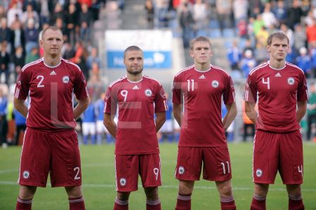 Latvijas futbola izlases spēlētāji Ritus Krjauklis (nr.4, sarkans), ...