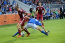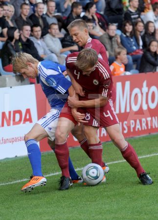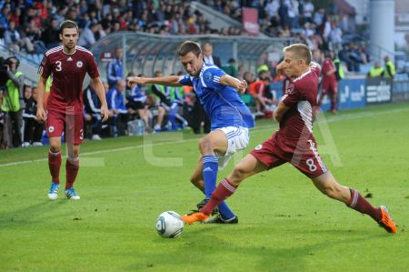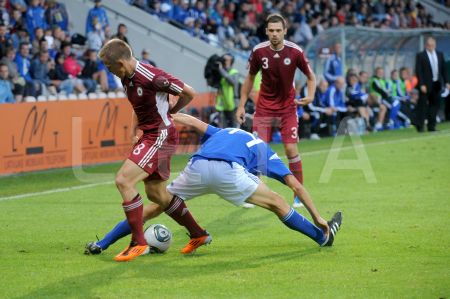 Latvijas futbola izlases spēlētājs Andrejs Kovaļovs (nr.14, sarkans) ...