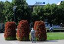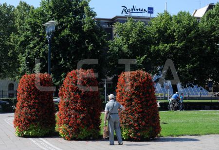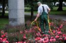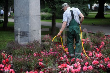 Dārznieks aplaista puķu dobes Vērmanes dārzā karstajā vasaras dienā.