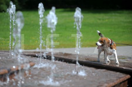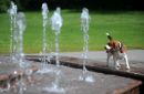 Suns atvēsinās pie Kongresu nama strūklakas karstajā vasaras dienā.