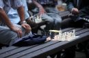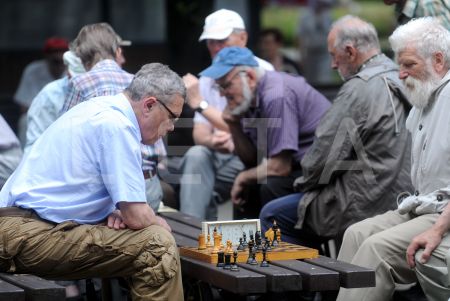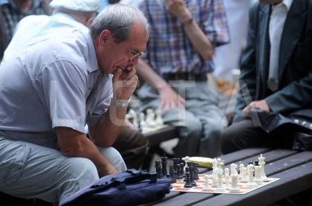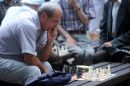 Vīrieši spēlē šahu Vērmanes dārzā.