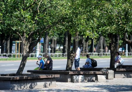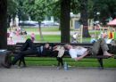 Vīrieši atpūšas Vērmanes dārzā karstajā vasaras dienā.