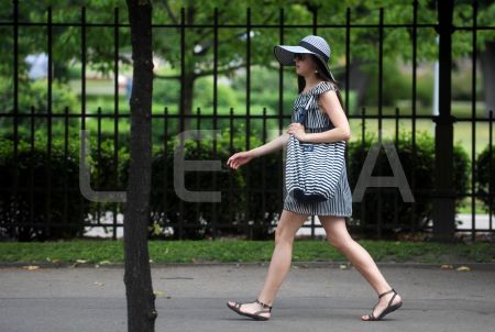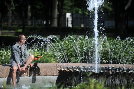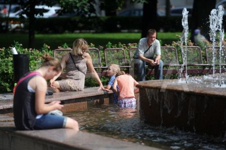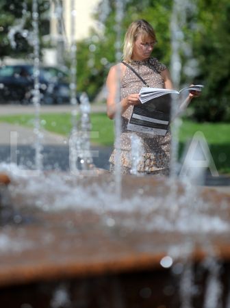 Sieviete atvēsinās pie Kongresu nama strūklakas karstajā vasaras ...