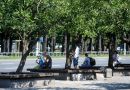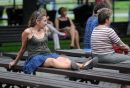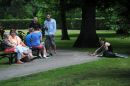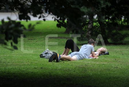 Cilvēki atpūšas Vērmanes dārzā karstajā vasaras dienā.