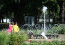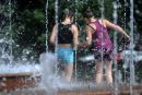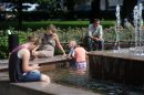 Cilvēki atvēsinās pie strūklakas karstajā vasaras dienā.