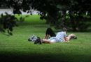 Cilvēki atpūšas Vērmanes dārza zālienā karstajā vasaras dienā.