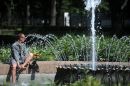 Cilvēki atvēsinās pie Kongresu nama strūklakas karstajā vasaras dienā.