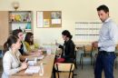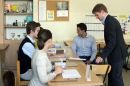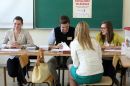 Cilvēki pašvaldību vēlēšanu iecirknī Nr.3 Rīgas valsts 1.ģimnāzijā.