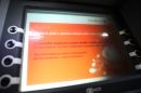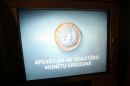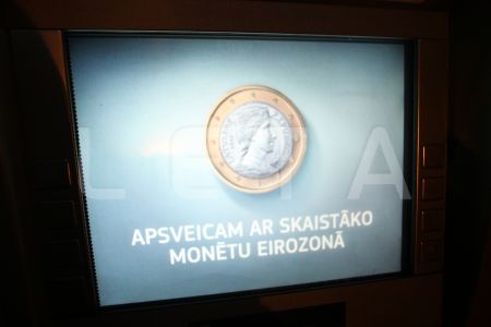 Uzraksts bankomātā "Apsveicam ar eiro ieviešanu Latvijā!" pēc ...